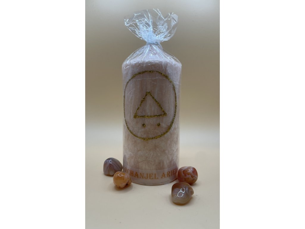 Sviečka Archanjel Ariel - Božia levica je naplnená ochraňujúcou a láskavou energiou archanjela Ariela, ktorý nám pomáha pri starostlivosti o prírodu a liečení zvierat. Jeho energia je spojená s bledooranžovou aurou, ktorá symbolizuje teplo, ochranu a harmóniu, ktoré nám poskytuje na našich cestách. Karneol, kameň vitality a prosperity, zosilňuje jeho schopnosť pomáhať pri napĺňaní našich fyzických potrieb, ako sú peniaze, príbytok a potrava.