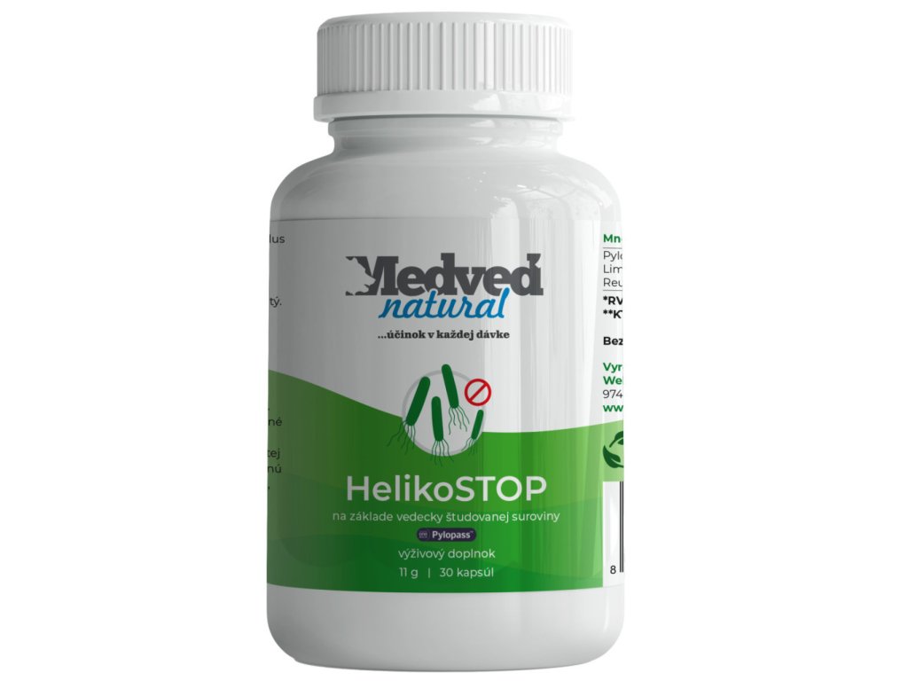 HelikoSTOP je výživový doplnok pre osoby s výskytom baktérie Helicobacter pylori v žalúdku. Obsahuje klinicky overený kmeň Limosilactobacillus reuteri DSM 17648 (Pylopass™), ktorý sa naväzuje na baktériu H. pylori a podporuje jej postupné odstránenie z organizmu.