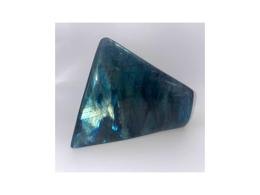 Veľký tromlovaný labradorit s hmotnosťou 1,316 kg a rozmermi približne 15x12 cm. Kameň intuície a ochrany, známy svojím nádherným farebným odleskom.