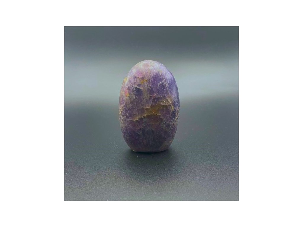 Leštený lepidolit v tvare stojaceho oválu so zbrúsenou základňou, výška cca 8 cm, šírka 5 cm, hmotnosť 177 g.