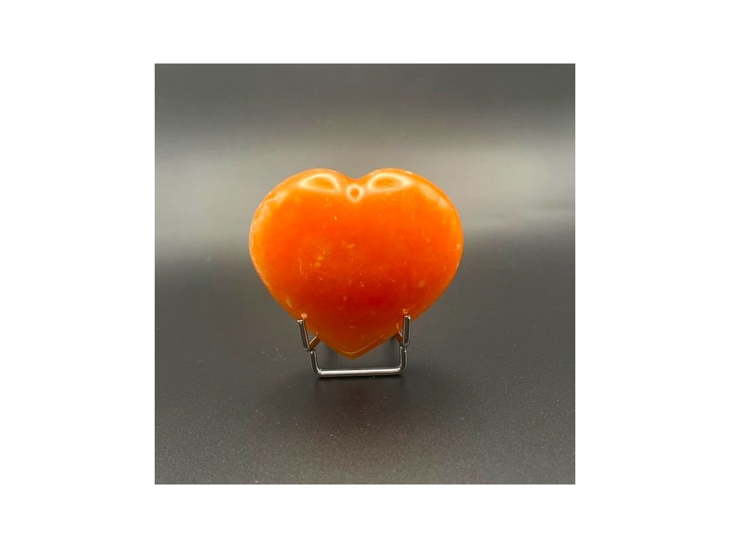 Oranžový kalcit v tvare srdca, približná šírka 7 cm, hmotnosť 146 g.