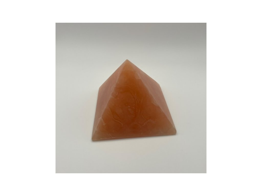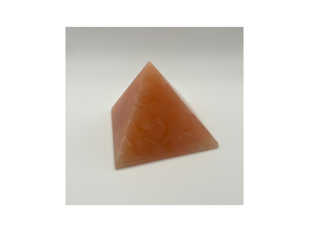 Pyramída z oranžového kalcitu s rozmermi 8 × 8 x 8 cm a hmotnosťou 328 g. Kalcit je kameň vitality, radosti a pozitívnej energie, vhodný na oživenie priestoru.