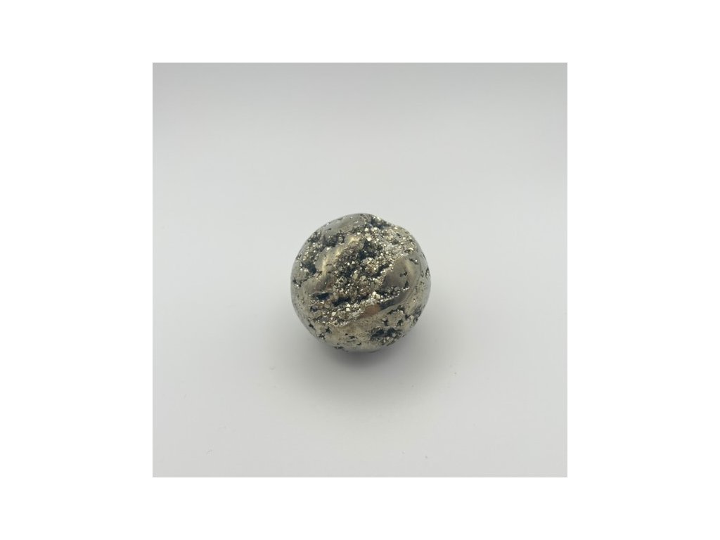 Leštená guľa z pyritu s rozmermi približne 7 × 6 cm.