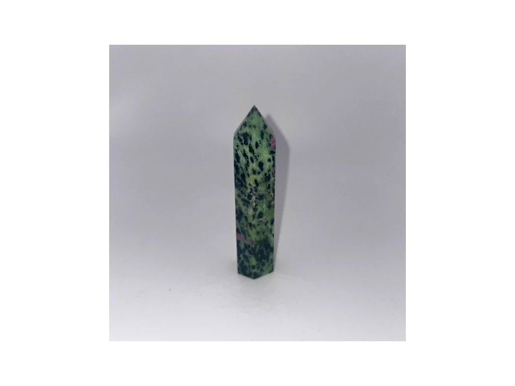 Prírodný rubín v zoisite opracovaný do tvaru hexagónu, prizmy, približné rozmery 9 × 2,5 cm.