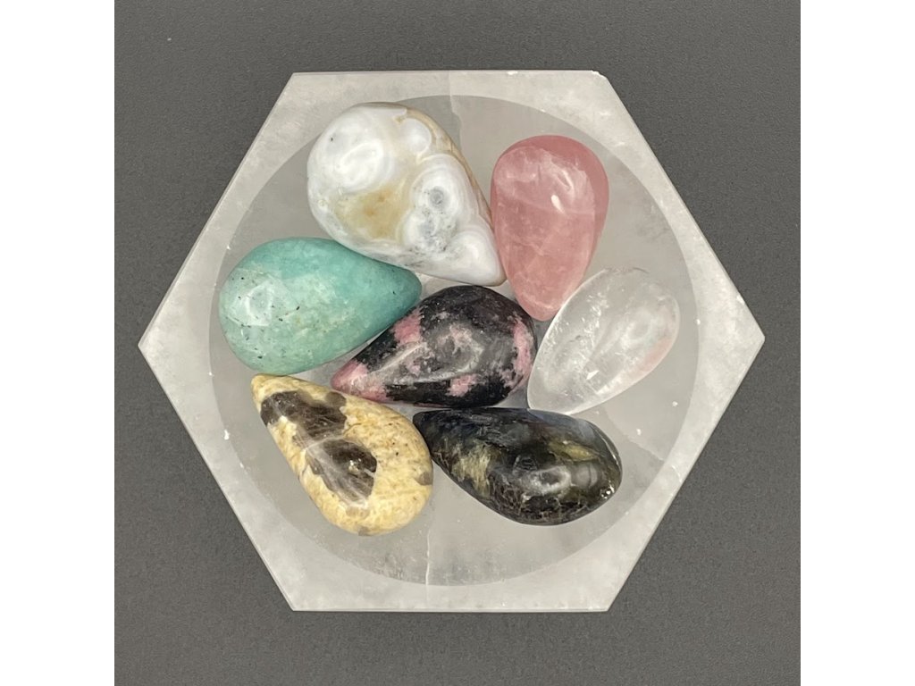 Krásny mix prírodných minerálov v tvare slzy, vďaka ktorému si môžete vybrať kameň podľa farby alebo pocitu. Každý kúsok je originál – od jemného ruženínu cez energický amazonit, ochranný rodonit až po číry krištáľ. Ideálny ako dekorácia, talizman do vrecka alebo darček pre milovníkov kameňov.