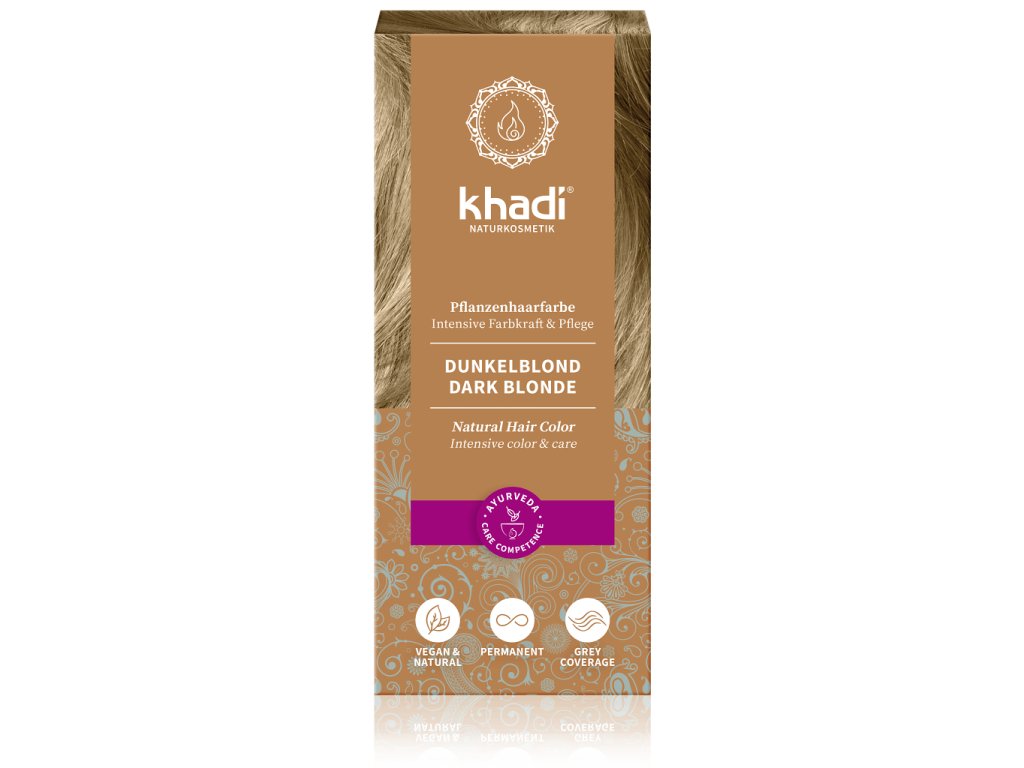 Tmavá blond je chladný odtieň, pôsobí sebavedomo a je absolútne trendová – Khadi rastlinná farba na vlasy Tmavá blond farbí vlasy sýtou, popolavo tmavou blond farbou, bez podielu červeného tónu. Výsledný tón závisí od východiskovej farby Vašich vlasov, ako aj od zvolenej doby pôsobenia. Svetlým vlasom dáva stredne až tmavo popolavý blond odtieň, tmavým vlasom dodá krásny chladný lesk. A spolu s farbou zároveň výrazný lesk, bohatý objem a intenzívnu starostlivosť v jednom kroku!